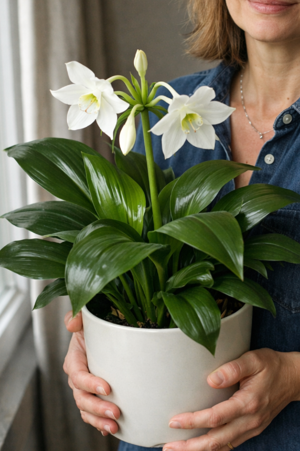 Еухаріс приваблює не лише цвітінням, а й декоративним листям — рослина виглядає охайно та дорого навіть поза періодом цвітіння. Це саме той варіант, коли квітка прикрашає інтер’єр постійно, а не “час від часу”.