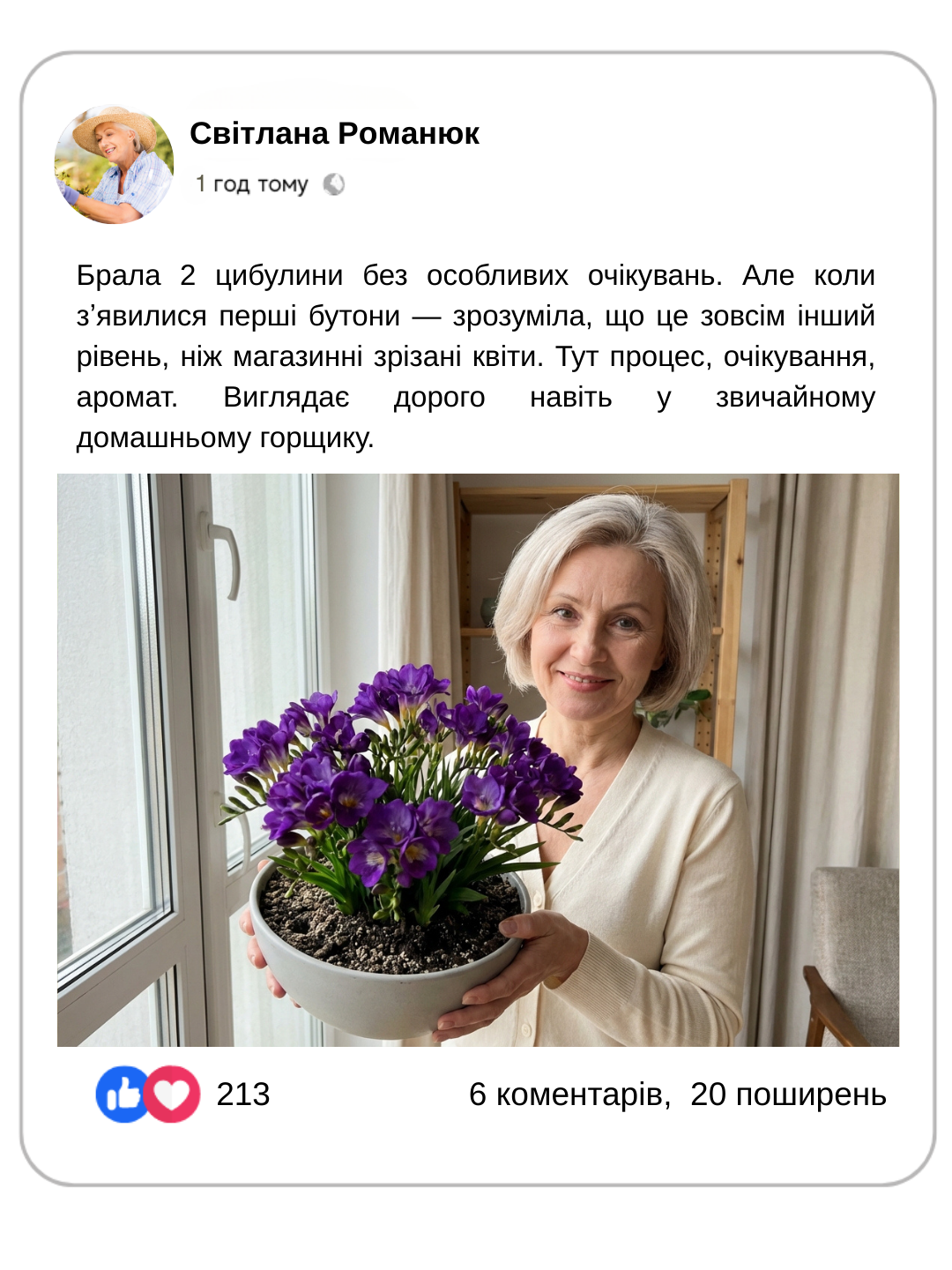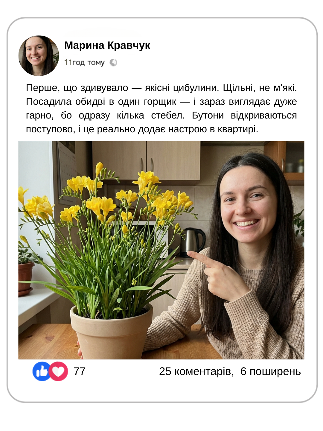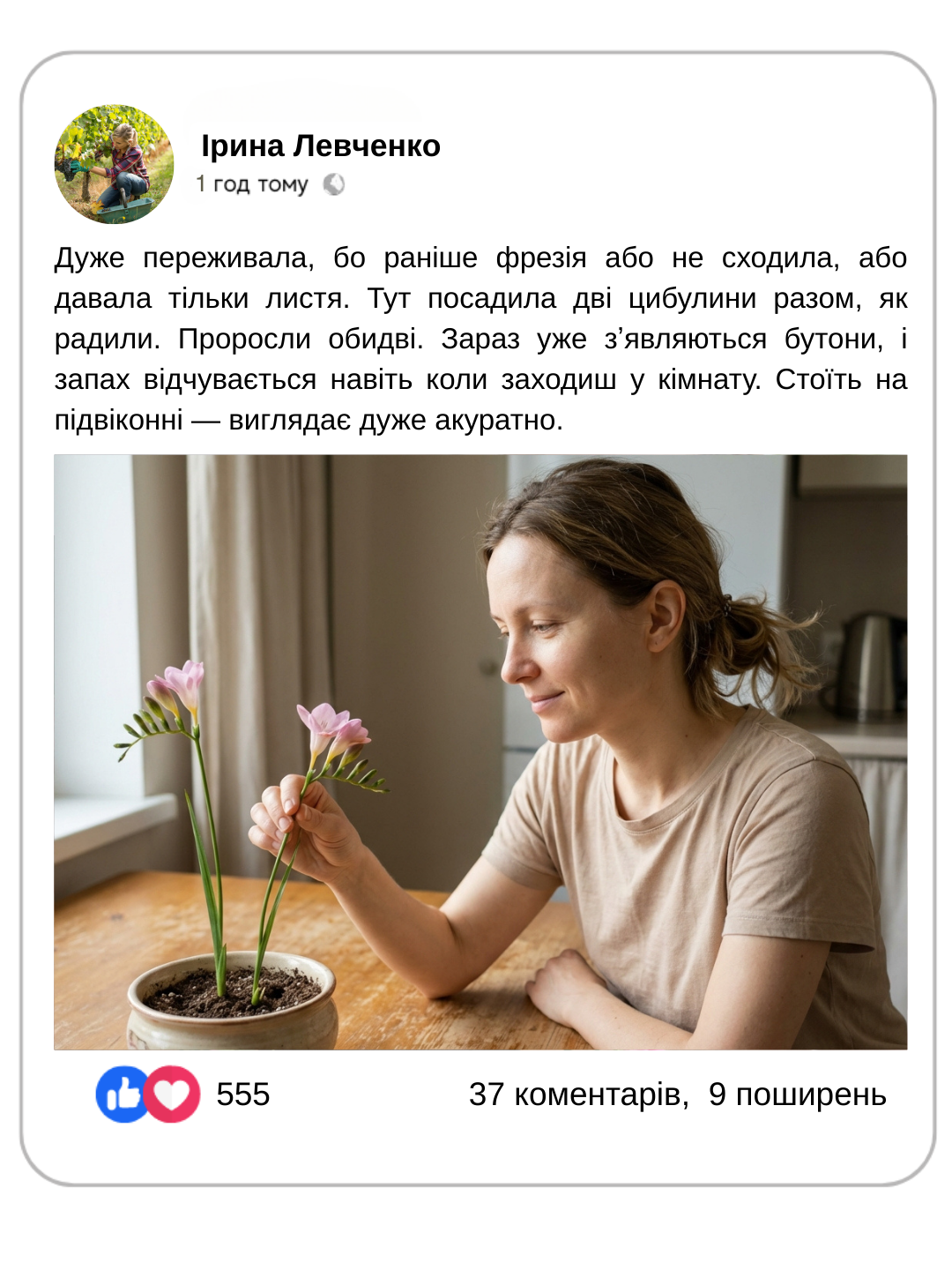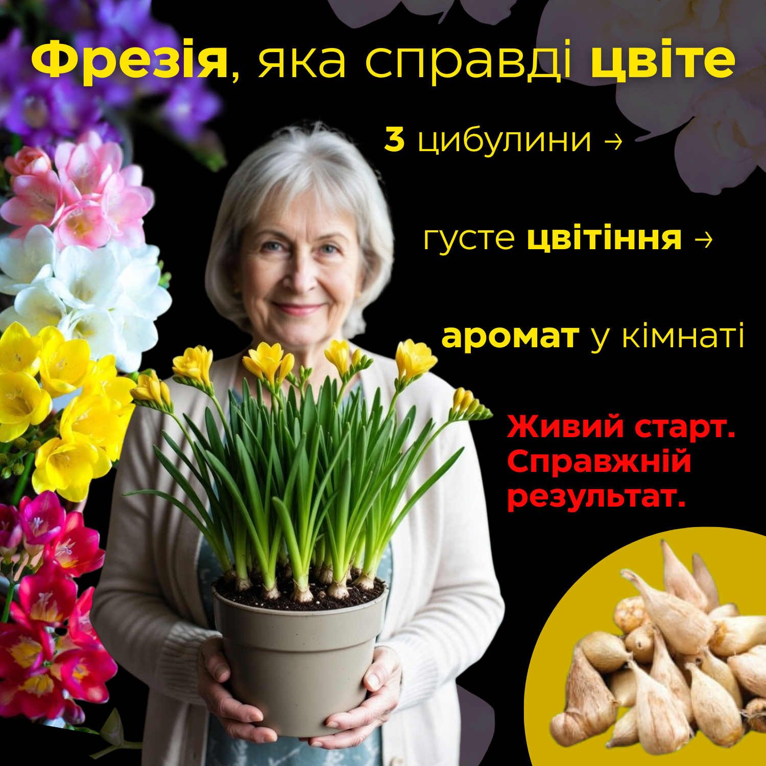 2 відбірні цибулини фрезії + простий сценарій посадки та догляду без “на око”.