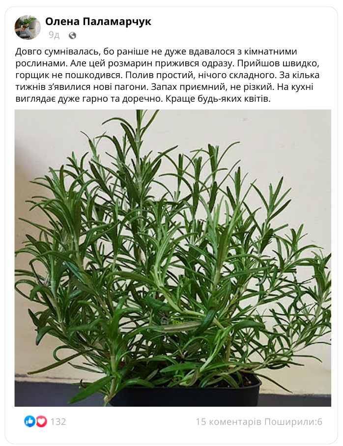 Вічнозелений розмарин у професійних горщиках П9 — це повністю готове рішення для вашої кухні чи балкону, яке не потребує пересадок. Достатньо просто дістати з горщик посилки, поставити на світле підвіконня та поливати 2–3 рази на тиждень.