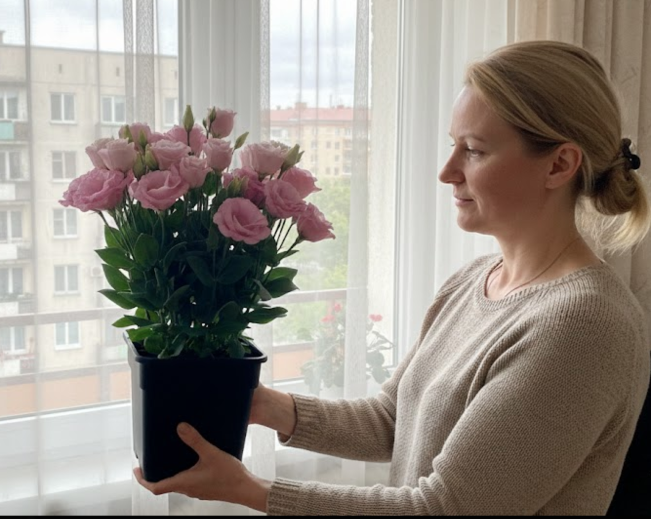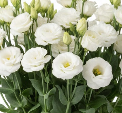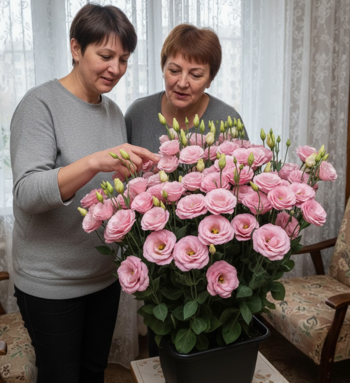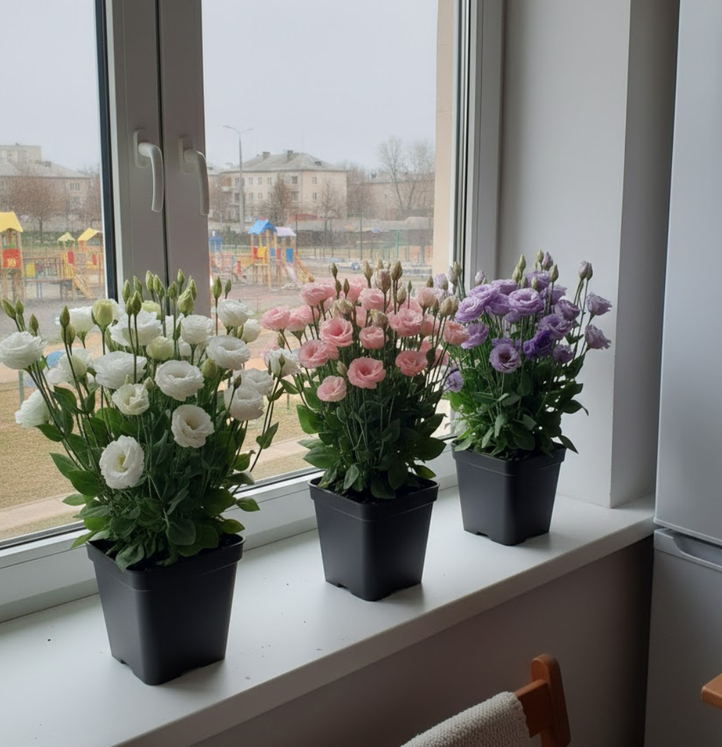Лізіантус «Адалін» — це великі шовковисті квіти з багатошаровими пелюстками виглядають як з бутик-флористики. Кущ формується компактно та акуратно — приблизно 35–55 см заввишки, без хаотичного розростання. На піку цвітіння рослина може одночасно тримати 20–40+ бутонів, тому вигляд завжди об’ємний і святковий, навіть у звичайній квартирі.